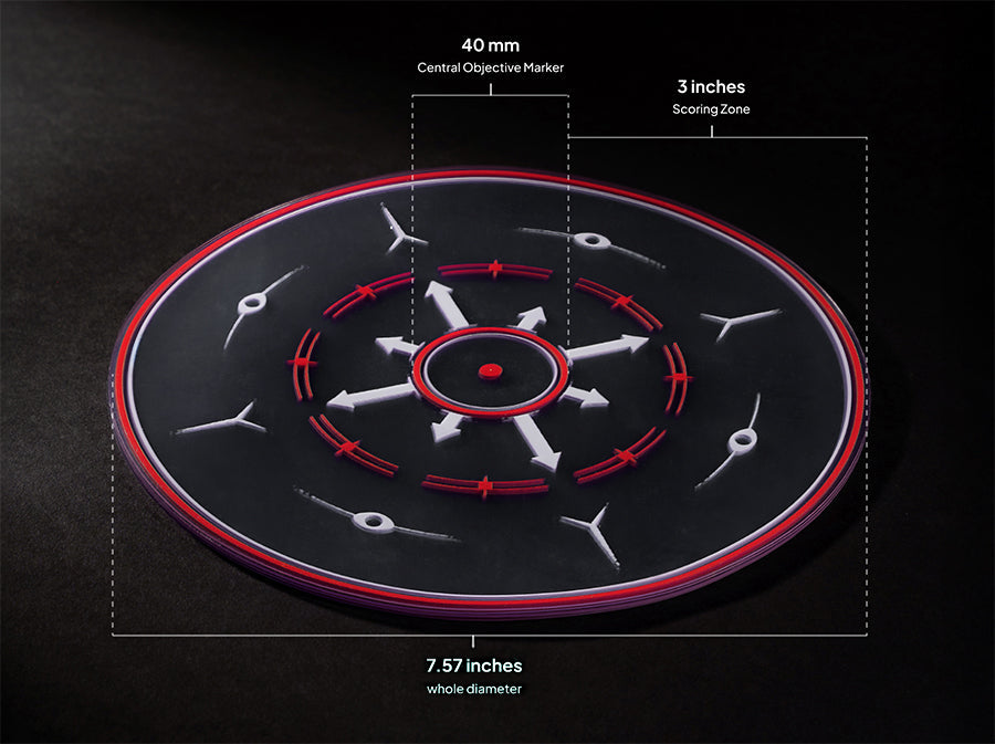 Printed on durable, non-slip clear vinyl polymer. With a 7.57-inch total diameter edge-to-edge, a 40mm central objective marker zone marked with an inner circle, and a 3-inch scoring area beyond, to keep the objectives clear and the focus on the fight.